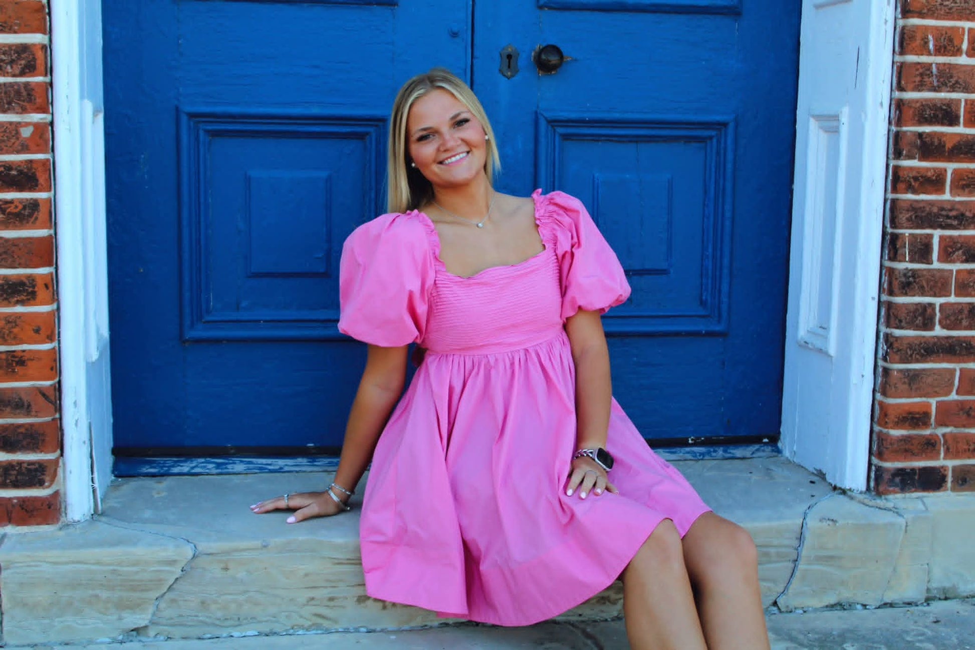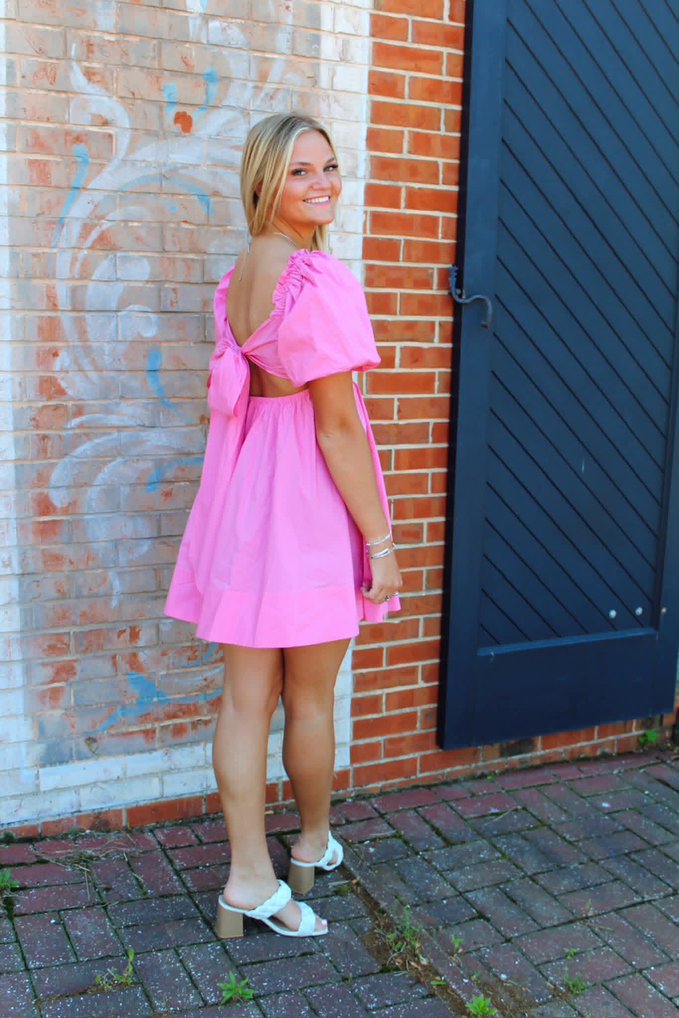 Sweet, flirty, and full of charm—this cotton babydoll dress brings all the fun. Designed with a smocked bust, puff short sleeves, and a square neckline, it's effortlessly cute and game day ready. The real MVP? An oversized bow in back ties it all together. Pair it with sneakers or boots and you're set for stadium snaps, tailgates, or post-game plans.