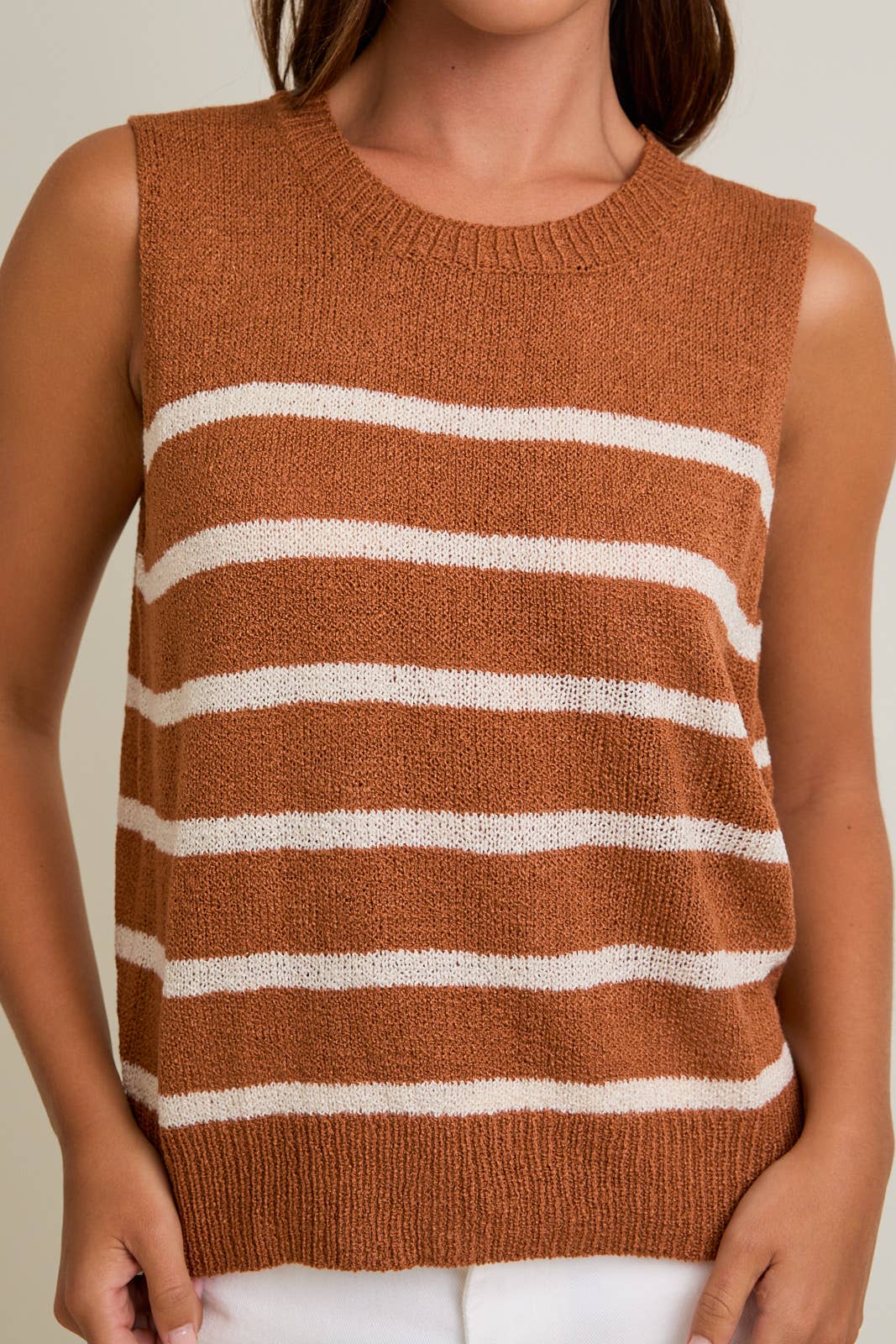 Turn heads in cozy, warm tones with our Sutton Sweater Tank. This sleeveless knit features a rich copper base with soft cream stripes and a classic round neckline for a timeless yet playful look. Crafted from 100% acrylic, it's lightweight enough for layering and perfect for transitioning between seasons. Pair it with denim or a neutral trouser for an effortlessly chic outfit.