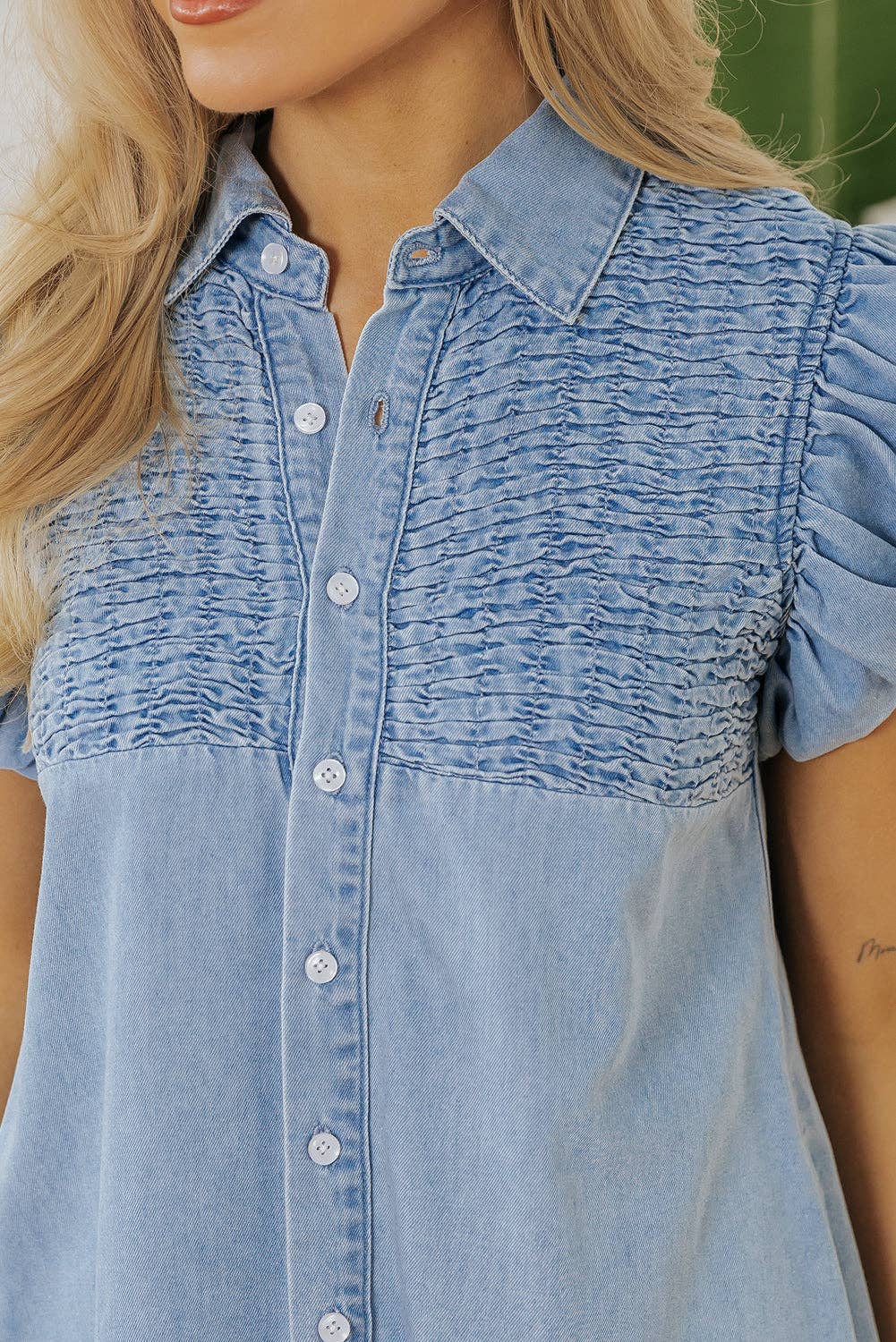 Say hello to your new go-to: the Vanessa Denim Flutter Dress in soft Beau Blue. With breezy flutter sleeves, gentle shirring, and a classic button-up front, this dress brings casual charm with a feminine twist. The relaxed shift silhouette flatters every figure while offering all-day comfort. Whether you're brunch-bound or weekend wandering, Vanessa is the kind of dress that does it all—no overthinking required.