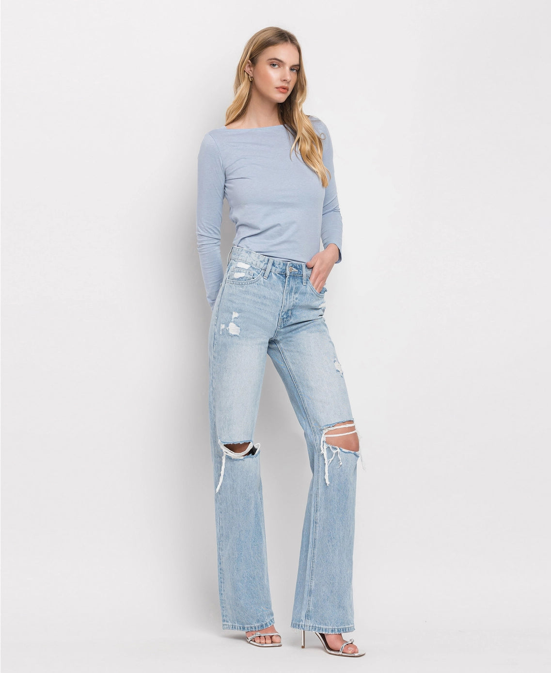 Non stretch denim, super high rise waist, 90's vintage style, distressed detail, full length, flare jeans.